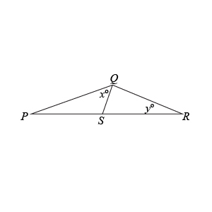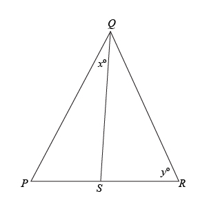 We know that sides $PS$ and $SR$ must be equal. However, the triangle doesn’t have much else in terms of things to constrain it. Let’s arbitrarily choose one of the quantities and try to find its extreme values. Quantity B is angle $y$, so let’s try to draw triangles with $y$ as small as possible and $y$ as large as possible to capture its range of extreme values.