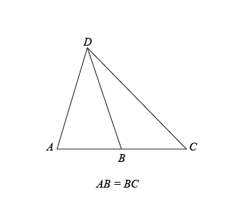 Since we’re given that $AB=BC$, let’s make our bases of our two triangles $AB$ and $BC$. Now, let’s keep in mind that the height is drawn so that it is perpendicular to the line containing the base of a triangle, and the height MUST touch the vertex of the triangle that doesn’t lie on this line and is perpendicular to the base. When we draw this in, we’ll notice that the height is the same for $△ABD$ as it is for $△BCD$: